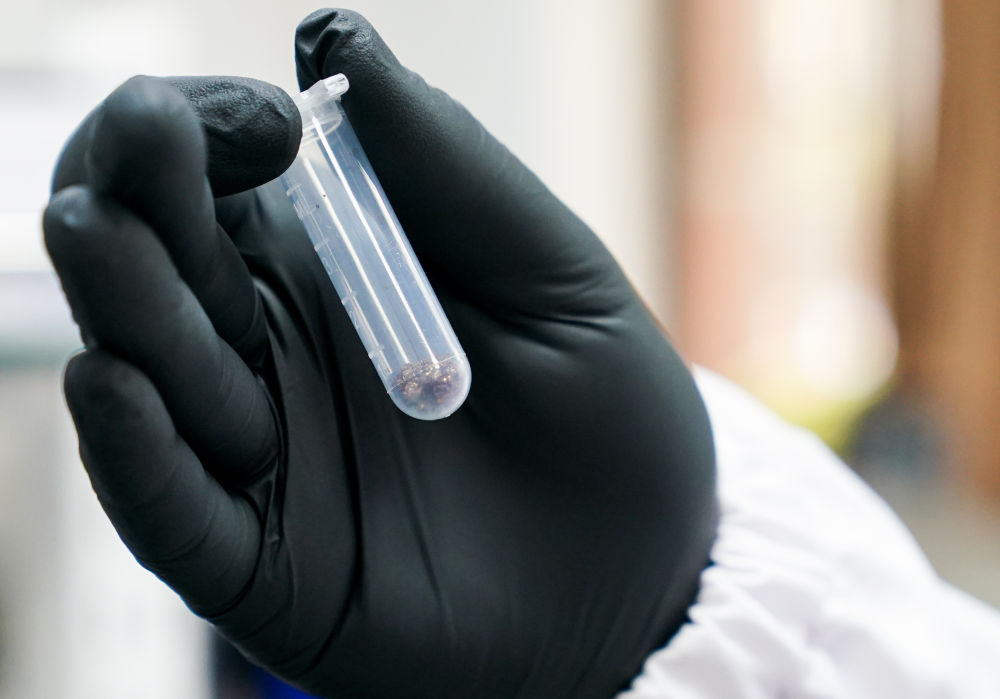 上海师范大学资源化学教育部重点实验室科研人员展示通过“光催化贵金属溶解”技术提取出的贵金属。 新华社记者 丁汀 摄
