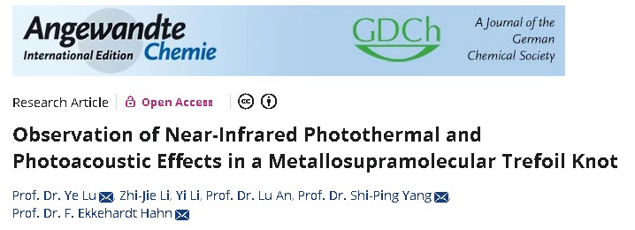 近日,我院鲁烨副教授/杨仕平教授团队在机械互锁分子的光学应用研究领域取得突破性进展。相关研究成果以“Observation of Near-Infrared Photothermal and Photoacoustic Effects in a Metallosupramolecular Trefoil Knot”为题,发表于国际化学领域顶尖期刊《德国应用化学》(Angewandte Chemie International Edition)。该研究首次在金属超分子三叶结(trefoil knot)结构中成功观测到近红外光声效应,为开发新型生物光声材料和拓展机械互锁分子的应用提供了全新的设计思路。