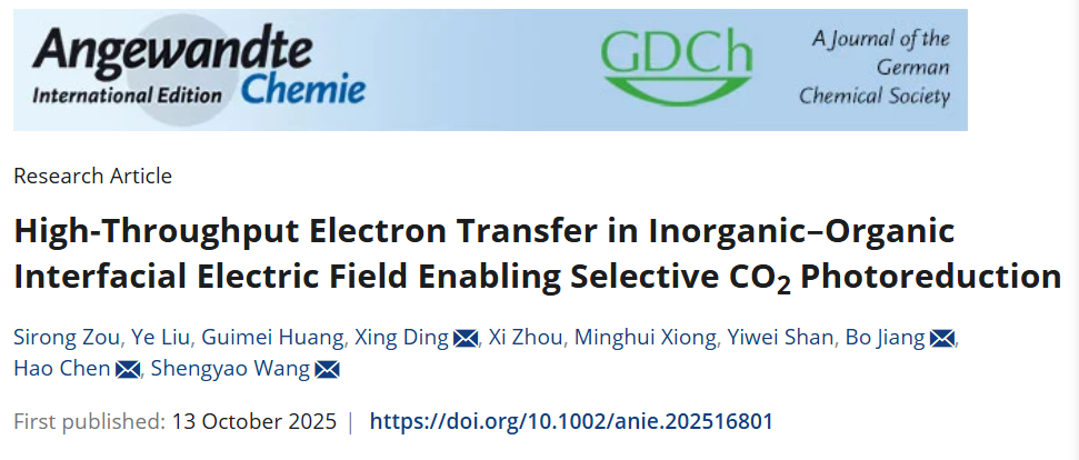 近日,学院蒋波教授与上海交通大学/华中农业大学合作,在《Angewandte Chemie International Edition》上发表了题为“High-Throughput Electron Transfer in Inorganic–Organic Interfacial Electric Field Enabling Selective CO2 Photoreduction”的研究论文。
