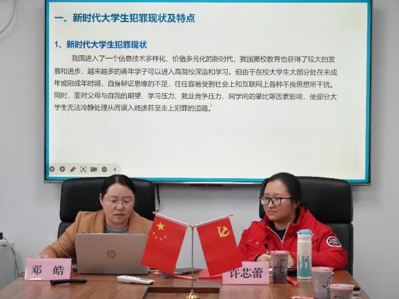 活动伊始,邓皓老师点明本次分享的三大核心内容:新时代大学生犯罪现状及特点、典型法律案例解析和犯罪预防建议。她强调,18岁以上大学生在法律上属于完全民事行为能力人,需独立承担民事与刑事责任,而当下信息技术多样化、价值多元化的时代背景,使得大学生犯罪呈现出手段智能化、时间自由性、场景特定化等特点,需引起同学们高度重视。