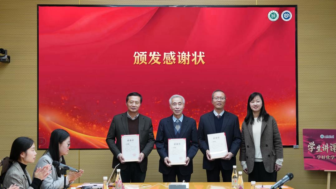 化材学院党委书记叶蔚蓝为第四季指导教师颁发聘书,并为连续多届指导的竺际舜、徐雪峰、贾能勤三位老师颁发感谢状,表达学院最诚挚的谢意。